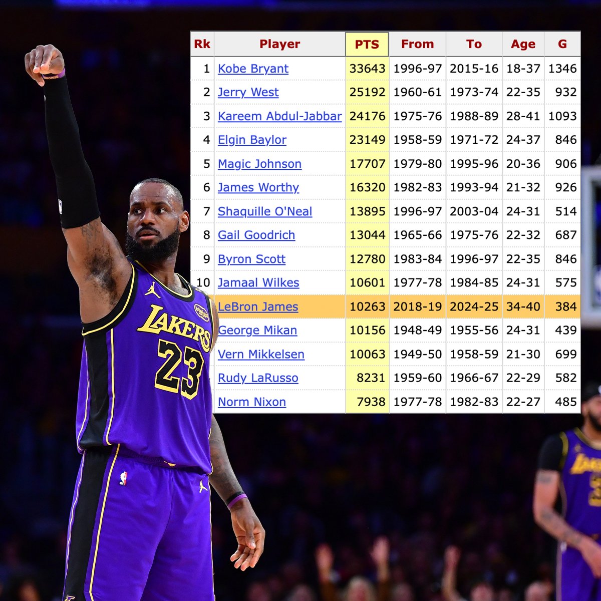 紫金传奇!詹姆斯本赛季有望进入湖人队史得分榜前十